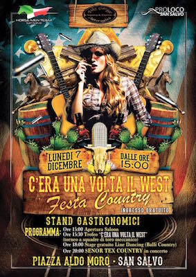 SAN SALVO (CH) – La Horse Men Team in collaborazione con la ProLoco di San Salvo organizza lunedì 7 Dicembre “C’era una volta il WEST”, la prima festa country dedicata al CowBoy. La manifestazione si terrà all’interno del Nottambula Winter Village, tensostruttura di 450mq che verrà posizionata in piazza Aldo Moro a San Salvo (CH) per il periodo natalizio.