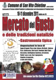 SAN VITO CHIETINO (CH) – Si terrà da sabato 10 dicembre 2011 alle ore 16.00 fino a domenica 11 dicembre 2011 alle ore 23.30 a San Vito Teatino, la quinta edizione del Mercato del Gusto e delle tradizioni natalizie.