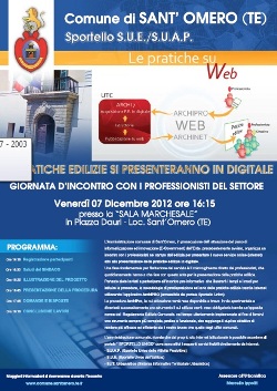L’incontro pre-informativo si svolgerà oggi,7 dicembre 2012 alle ore 16.15 , presso la Sala Machesale in piazza Dauri a Sant’Omero ed avrà la funzione di illustrare i tempi e i modi per istituire la procedura, le metodologie di predisposizione ed invio delle pratiche tramite applicativo ArchiPro.