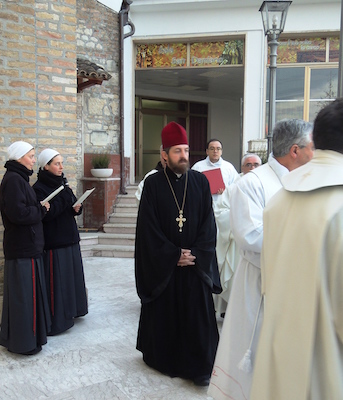 Alle ore 16 devoti e pellegrini provenienti da varie parti d’Italia e dall’estero si sono radunati nello spazio antistante il santuario. Intorno alle 16.30 diversi sacerdoti sono usciti in processione dalla sala San Damiano, per porsi alla testa del popolo presente, dirigendosi davanti alla porta santa. Tra i ministranti il protopresbitero Anatoliy Grytskiv, responsabile del Patriarcato Ecumenico di Costantinopoli per l’Abruzzo e Molise.
