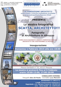 PESCARA – Sarà inaugurata oggi, domenica 1 febbraio 2015, alle ore 18,presso il Circolo Aternino, in Piazza Garibaldi n. 51,a Pescara,la mostra “Scatta, Architetto!!!”. Organizzata dalla Fondazione Architetti Centro Studi e Ricerche – Area Metropolitana Pescara Chieti, presieduta dall’architetto Gaetano Parere, la mostra vedrà l’esposizione delle fotografie di 6 professionisti iscritti agli Ordini degli Architetti di Chieti e di Pescara fino al 5 febbraio 2015.