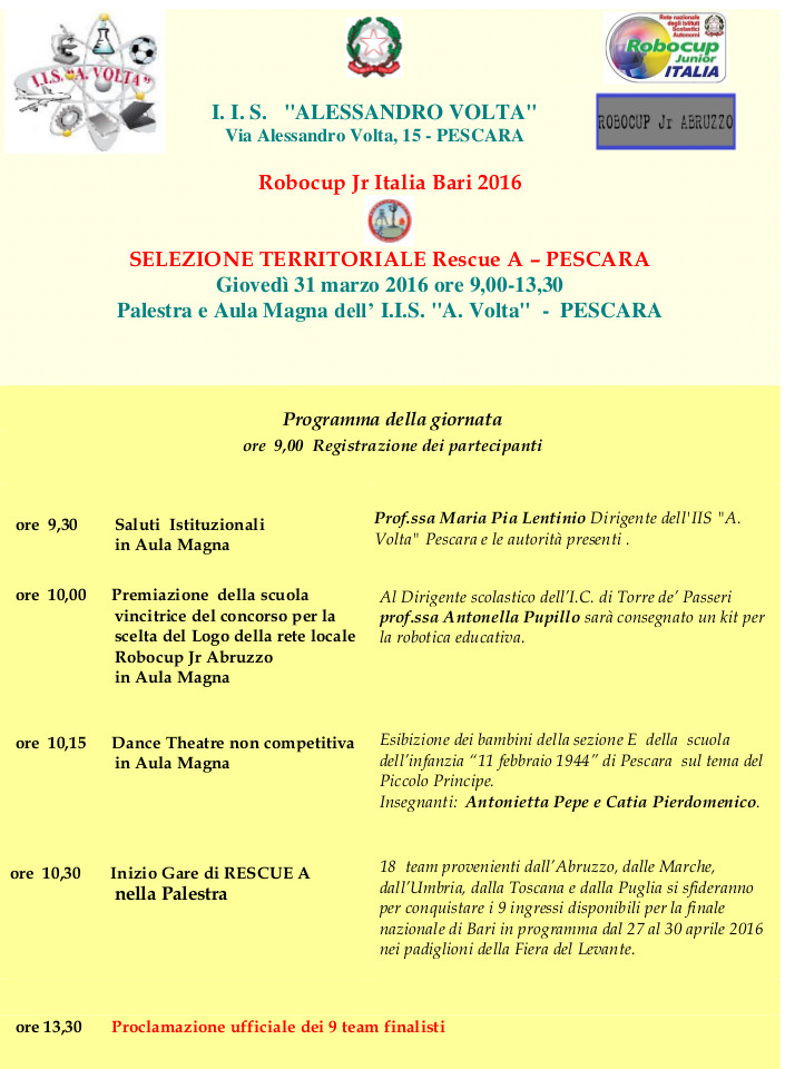 Le squadre in gara saranno accolte in Aula Magna dal dirigente scolastico dell’IIS Volta, prof.ssa Maria Pia Lentinio, e dal docente referente, prof. Renzo Delle Monache. Prima dell’inizio delle gare, prevista per le ore 10.30, sono in programma la premiazione dell’IC di Torre de’ Passeri, membro della rete Robocup Jr Abruzzo (Rc.J.A) e vincitore del concorso per la scelta del Logo della rete stessa, e l’esibizione di Dance-Theatre non competitiva dei bambini della sezione E della Scuola dell’infanzia “11 febbraio del ‘44” dell’IC 7 di Pescara.