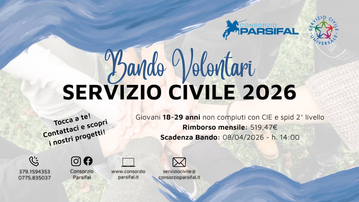 Per ulteriori chiarimenti è possibile contattare l’Ufficio Servizio Civile del Consorzio Parsifal ai numeri 0775.835037 e 379.1594353 (anche WhatsApp), oppure tramite social o all’indirizzo email serviziocivile@consorzioparsifal.it.