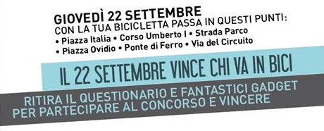 Pescara : L’associazione Pescarabici organizza al lavoro in bicicletta. Dalle ore 7,30 alle ore 9,30 del 22 settembre 2011 l’associazione conterà e premierà tutti coloro che a Pescara useranno la bicicletta per recarsi a scuola o al lavoro, istituendo ‘caselli ciclistici’ in sei punti della città e lasciando a tutti un piccolo gadget, come ringraziamento per la loro azione positiva.