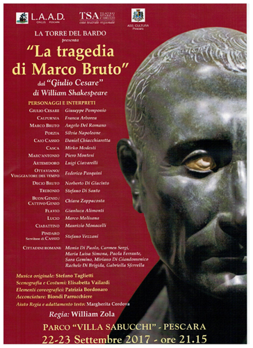 PESCARA – Una riduzione del Giulio Cesare di Shakespeare sarà di scena nel parco il 22 e il 23 settembre per l’edizione 2017 del progetto Torre del Bardo, felice sinergia con Teatro Stabile d’Abruzzo e la Onlus della Laad a cura del regista William, con il patrocinio del Comune.