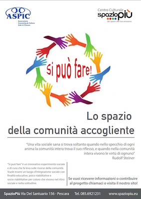 PESCARA – “SI PUO’ FARE” si presenta come uno spazio diurno rivolto a persone con disabilità psichiche di età compresa tra i 20 ed i 40 anni, in collaborazione con il centro culturale SpazioPiù (via del santuario 156, Pescara) e con l’associazione Aspic (Associazione per lo sviluppo psicologico dell’individuo e della comunità).