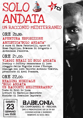 PESCARA – Sabato 23 gennaio dalle 20 a Pescara, il circolo Arci Babilonia in via Campobasso 13, presenta un evento interamente dedicato ai migranti: l’esposizione artistica “Solo Andata”, a cura di Mara Patricelli, aprirà la serata alle 20. Alle 21, seguirà “Viaggi reali di sola andata”, un incontro in cui il presidente dell’ Arci di Pescara Valerio Antonio Tiberio dialogherà con Destiny e Jeffrey, due giovani nigeriani ospiti del centro di accoglienza LAPISS nell’Oasi WWF di Penne. L’evento culminerà alle 22 con il reading musicale “Solo andata. Un racconto mediterraneo”, lettura in musica tratta dall’omonimo testo poetico di Erri De Luca, interpretata da Marcello Sacerdote e accompagnata da canzoni ed interventi musicali di Domenico Imperato.