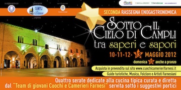 CAMPLI (TE) – L’Associazione Campli Domani in collaborazione con il “Team giovani cuochi e camerieri farnesi” ,nell’ottica del rilancio turistico-economico el paese, organizza dal 10 al 13 maggio 2012 la seconda rassegna eno-gastronomica dal titolo :“Sotto il cielo di Campli tra saperi e sapori”. Saranno quattro serate dedicate alla cucina tipica abruzzese , che verrà servita sotto i portici suggestivi delle vie del centro storico.