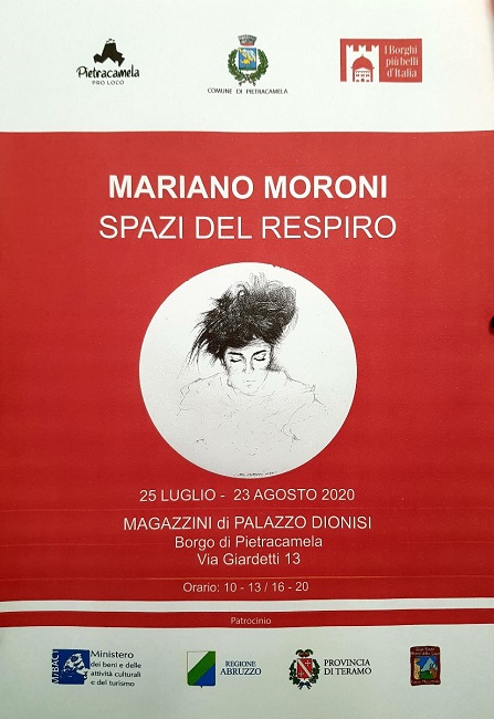 Pur essendo teramano, vive a Nereto, i suoi allestimenti in terra natia sono rari: l’incrocio con Pietracamela, insignita del titolo “Borghi più bella’d’Italia” ha rappresentato, come sottolinea lo stesso Moroni, una folgorazione ed è nata così la mostra “Spazi del respiro” nei magazzini di Palazzo Dionisi: la mostra, visitabile fino al 23 agosto, ospita opere inedite dipinte durante il confinamento da COVID.