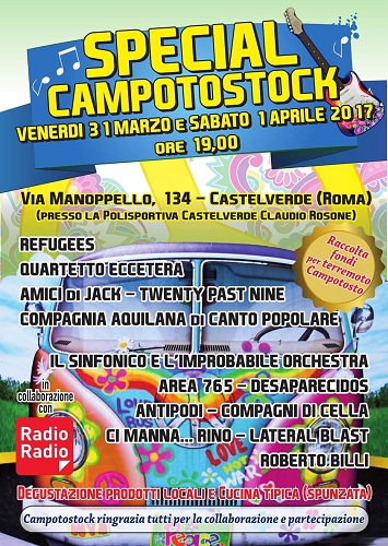 Questa la finalità di “Special Campotostock”: iniziativa musicale in programma per le serate di venerdì 31 marzo e sabato primo aprile a Lunghezza – Castelverde (Roma), nei locali della “Polisportiva Castelverde Claudio Rosone” (via Manoppello 134).