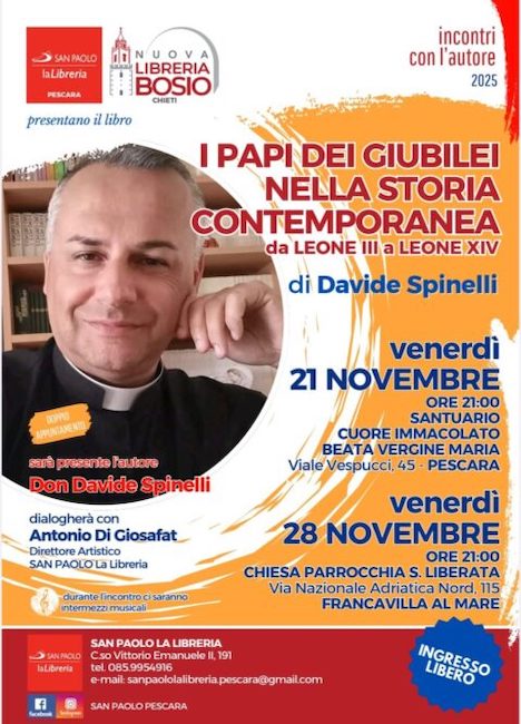 Il 21 novembre alle ore 21.00 l’appuntamento è presso il salone parrocchiale del Santuario Cuore Immacolato della Beata Vergine Maria a Pescara, mentre il 28 novembre, sempre alle ore 21.00, l’incontro si terrà nella Parrocchia Santa Liberata di Francavilla al Mare. L’opera ripercorre i giubilei dal 1900 al 2025, con curiosità, eventi e aneddoti che intrecciano la storia dei pontefici e le sfide della modernità.