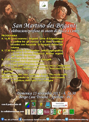 azione del San Martino: Giorgetti proporrà l’assaggio di diversi tipi di olio, distinti per cultivar e tipo di lavorazione, ossia se le olive hanno avuto la spremitura a freddo, quella tradizionale con le presse, oppure se sono state lavorate negli impianti della ‘continua’, e illustrerà ai cittadini come difendersi dalle contraffazioni”. Ma, come nella migliore delle tradizioni, anche l’edizione 2015 del San Martino avrà diversi momenti culturali e gastronomici: alle 17.30 il regista del Teatro del Sangro Stefano Angelucci Marino, rappresenterà ‘Una storia di San Martino’, con la lettura dell’agiografia tratta dal volume ‘Santi popolari e tradizioni di campagna’. A seguire Pasquale Di Prospero presenterà il volume ‘Dove osarono i briganti: storie di brigantaggio tra gli Abruzzi e lo Stato Pontificio’, e l’autore stesso racconterà alcuni episodi caratteristici dei briganti abruzzesi, a partire da Fra’ Diavolo, ucciso dai francesi 209 anni fa, proprio nel giorno di San Martino. Quindi spazio al professor Francesco Stoppa, Presidente del Cata dell’Università ‘d’Annunzio’ e presidente del Consorzio Tradizioni Teatine, che racconterà il ‘San Martino in Abruzzo’. A partire dalle 19 canti e balli della tradizione abruzzese di fine ‘800 con i componenti del Consorzio in abito tradizionale abruzzese, mentre Anna Recchia, Presidente dell’Associazione ‘Le Ginestre’ di Ortona, effettuerà la coloritura tradizionale della lana con i ricci delle castagne. Infine, assaggi del San Martino con l’olio e il vino novello, dolci col mosto cotto, zucca e patate, li sgajuzze, il dolce di San Martino e le classiche ‘rivotiche’, ossia le antiche focacce fatte con acqua e farina che vengono cotte in una padella ben unta di olio nuovo, una preparazione tipica dell’Abruzzo che veniva storicamente consumata da sola o farcita con formaggio e prosciutto, “il tutto – ha precisato il Presidente Troiano – sempre all’insegna del recupero della tradizione, dei suoi usi e costumi, al fine di non disperdere un patrimonio immenso che rappresenta la storia del nostro Abruzzo”. Nel corso della manifestazione verrà anche distribuito l’Almanacco del Transumante, fatti, curiosità e racconti scritti a mano in ogni copia.