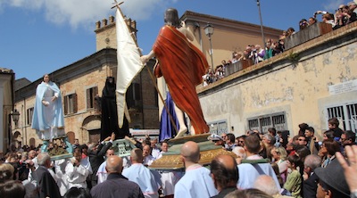 SPOLTORE (PE) – Si è svolta oggi, come ogni anno, nel giorno di Pasqua, in Piazza D’Albenzio, a Spoltore “La Madonna che corre”, una rievocazione entrata da decenni nelle tradizioni religiose della città,che vuole rappresentare la Gioia della Resurrezione ed il trionfo della vita sulla morte. Maria Maddalena corre per dare l’annuncio gioioso della Resurrezione del Cristo, ma la Madre, vestita di nero, non crede alla notizia.