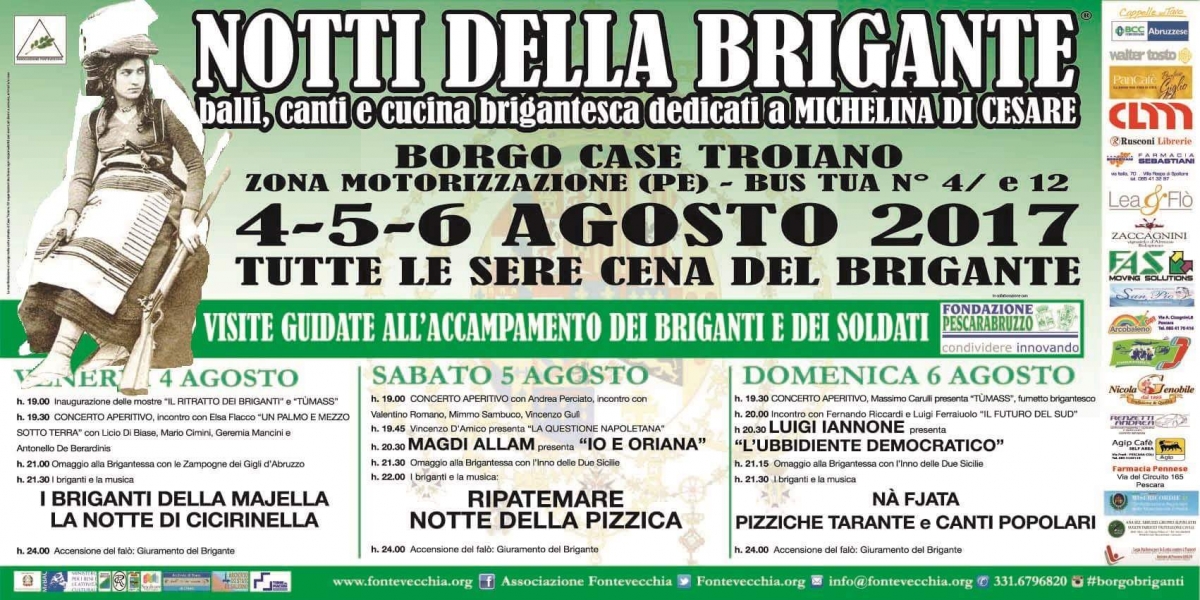 PESCARA – Saranno i giornalisti Magdi Allam, Luigi Iannone, e gli scrittori Mario Cimini, uno dei massimi esperti di d’Annunzio al mondo, e Mimmo Sambuco, pronipote di John Fante, i protagonisti della Settima edizione di ‘Notti della Brigante – Dedicato a Michelina Di Cesare’, la rassegna ormai entrata a pieno titolo negli appuntamenti tradizionali dell’estate abruzzese, promossa dall’Associazione Fontevecchia, che si svolgerà nel Borgo Case Troiano, sul territorio di Spoltore, zona motorizzazione civile, da oggi, venerdì 4 agosto, sino a domenica 6 agosto.