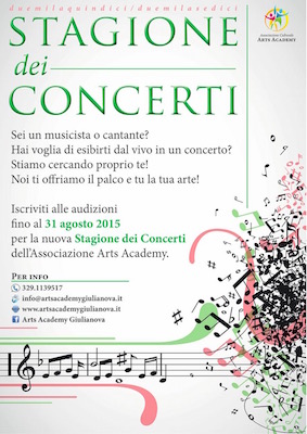 GIULIANOVA (TE) – Dopo il buon successo avuto con le iniziative interamente gratuite promosse per il “Maggio dei libri”, l’Associazione Culturale non-profit “ARTS ACADEMY” di Giulianova ha deciso ora di puntare sui talenti musicali del territorio, offrendo loro un palco sul quale esprimere al meglio la propria arte. Cantanti, musicisti, solisti, ensemble o band, potranno iscriversi alle selezioni per la nuovissima “Stagione dei Concerti dell’Arts Academy 2015/2016”.