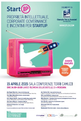 PESCARA – Mercoledì 15 aprile 2015, dalle ore 14:30 alle ore 18:00, presso la sala conferenze delle Torri Camuzzi (Largo Filomena Delli Castelli 10, Pescara) si terrà il convegno “Start IP. Proprietà Intellettuale, Corporate Governance e incentivi per Startup”, organizzato dallo studio legale Giancola Teti & Associati. L’evento è aperto a tutti e l’ingresso è libero.