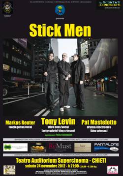 CHIETI – Stick Men: un trio di grandissimi musicisti che non ha certo bisogno di presentazione. Tony Levin, Pat Mastellotto & Marcus Reuter insieme in un progetto formatosi nel 2008: musica accattivante e stimolante che abbraccia la migliore tradizione del progressive rock.