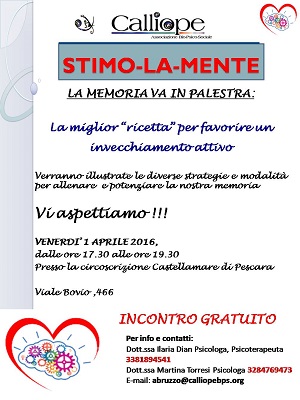 PESCARA – L’Associazione Calliope Bio-psico-sociale organizza un incontro gratuito sull’Invecchiamento Attivo, in cui verranno illustrate le diverse strategie e modalità per allenare e potenziare la memoria, in modo da migliorare le condizioni di vita dell’anziano e della sua famiglia. L’incontro si terrà presso la Circoscrizione Castellamare di Pescara in Viale Bovio 466, Venerdì 1° Aprile dalle 17.30 alle 19.30.