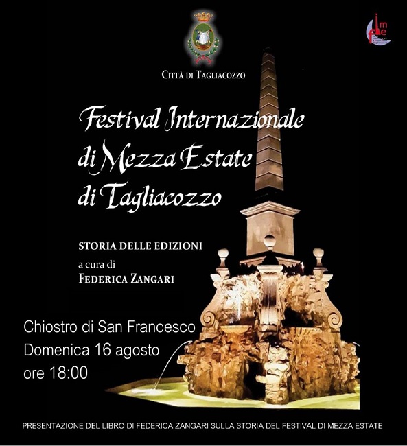 TAGLIACOZZO – Domenica 16 Agosto ore 18.00 presso la meravigliosa cornice del Chiostro di San Francesco verrà presentato il volume “Festival Internazionale di Mezza Estate di Tagliacozzo – Storia delle edizioni” a cura di Federica Zangari.