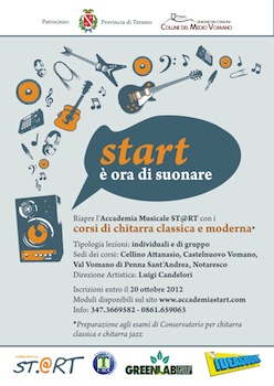 L’Associazione culturale St@rt, sotto la direzione artistica di Luigi Candelori, isitituisce per l’anno 2012/2013 “l’Accademia della Chitarra”, che propone lo studio della chitarra classica e della chitarra jazz a livelli professionali, con la possibilità di prepararsi per l’accesso al Conservatorio in tutti e due gli ambiti. Il Conservatorio dell’Aquila e quello di Pescara consentono di diplomarsi, fino al II livello, sia in chitarra classica che in chitarra jazz, mentre l’Istituto Musicale Braga di Teramo presenta solo la cattedra classica. “L’Accademia della chitarra”, che non trascurerà coloro che vogliono suonare per diletto, ha due sedi principali: Notaresco e Castelnuovo Vomano, con studi attrezzati con le più moderne tecnologie (chitarre classiche, elettriche, amplificatori, impianto voce, computer, microfoni).