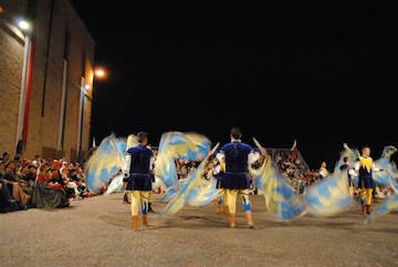 TORTORETO (TE) – Si è svolta il 12 e il 16 agosto la XIII edizione della rievocazione storica medievale : “Il Palio del Barone” che ha visto la presenza di oltre 2000 persone tra turisti e residenti e si è conclusa con il suggestivo incendio della Torre di Tortoreto.L’evento è ideato e organizzato dall’Associazione locale “Due Torri”. Dopo un digiuno di quattro anni, la contrada Terranova che, ha per emblema il Corvo con i colori bianco-verde, ha conquistato il “drappo” della vittoria disegnato quest’anno dall’artista di Ascoli Piceno, Giuseppe Alesiani. L’altro rione storico, quello di Terravecchia che, ha come simbolo la Tortora con i colori bianco-azzurro, rimane sempre in testa nella classifica generale con 7 drappi su 6, entrambe le squadre si sono sfidate in una vasta gamma di giochi medievali al fine di conquistare l’ambito premio. La serata è iniziata con il corteggio storico degli oltre 400 figuranti con alla testa il Barone Roberto di Turturitus interpretato da Gabriele Barcaroli, accompagnato dagli armigeri, che lungo la strada incontrava i titolari dei vari esercenti commerciali con cui, in segno di buon auspicio, faceva il brindisi. Poi la Baronessa, interpretata da Lidia Ciccarelli, insieme alle sue ancelle, ai giullari di corte e alle damigelle. A seguire c’erano le folte delegazioni ospiti con la partecipazione dei gruppi storici di Castel di Luco, della