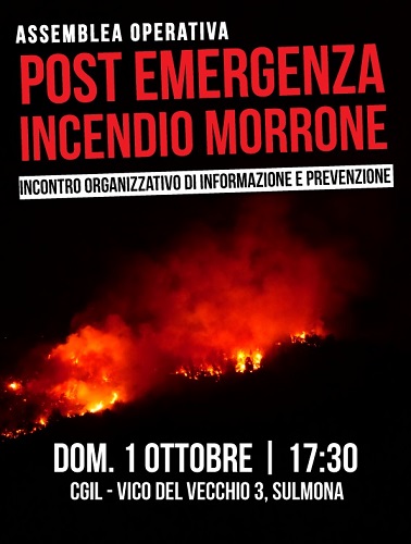 SULMONA (AQ) – Domenica 1° ottobre,alle ore 17.30, presso la sede Cgil di Sulmona in Vico del Vecchio 4 , si terrà una assemblea operativa post-emergenza incendio. Saranno organizzati gruppi di lavoro e tavoli operativi per costruire una mobilitazione di vigilanza e in-formazione sul post-emergenza e sugli investimenti pubblici.