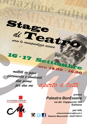 SULMONA (AQ) – A Sulmona, presso la Palestra BenEssere, sita in via dei Cappuccini 104, nei giorni 16 – 17 settembre 2016 dalle ore 14.00 alle ore 16, si svolgerà uno Stage di teatro.