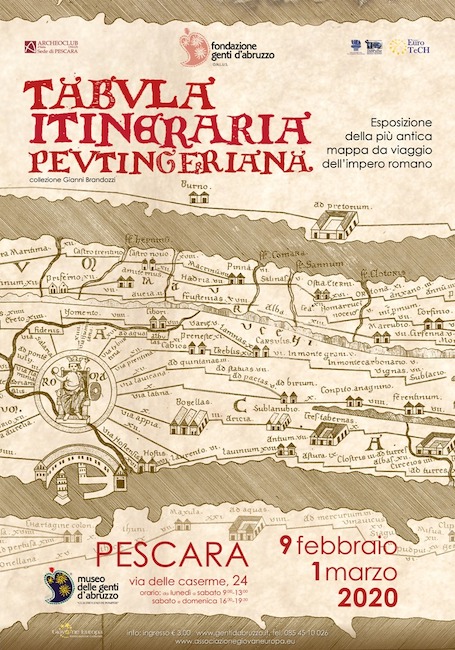 Sarà infatti esposta all’interno della sala Favetta del Museo Genti d’Abruzzo la Tabula Itineraria Peutingeriana, il più antico documento da viaggio conosciuto dell’impero romano, che fotografa l’estensione dell’impero al tempo di Teodosio, della collezione Gianni Brandozzi.