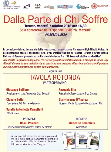 Nel filmato l’esperienza negli anni 72’-74’ del giornalista del quotidiano La Stampa di Torino Gigi Ghirotti durante la sua malattia che si presta ad una profonda riflessione sullo stato della persona malata e delle difficoltà che ancora oggi attraversa. Al termine del filmato, seguirà una tavola rotonda “Dalla parte di chi soffre” con: Giuseppe Belfiore, Presidente Associazione Abruzzese Gigi Ghirotti; Claudio Boffo, Consigliere AIL Pescara-Teramo; Sorella Antonietta Campitelli, CRI-Teramo; Pasquale Elia, Presidente Associazione Erga Omnes e Gianvincenzo D’Andrea, Vicepresidente nazionale Fondazione ISAL. Presiede i lavori, Raoul Pomanti, Presidente Comitato locale Croce Rossa di Teramo, mentre il giornalista Walter De Berardinis modererà gli interventi.