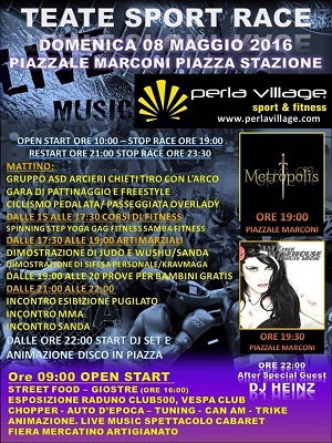 Domenica 8 maggio la manifestazione prenderà il via fin dalle ore 9.00 del mattino con la Festa dello Sport che vedrà susseguirsi in piazzale Marconi e sul piazzale della stazione gare di tiro con l’arco (a cura dell’Asd Arcieri Chieti), basket baby, freestyle su rotelle, passeggiata over lady e da Perla Village, in via Pescara, dalle 15.00 alle 17.30, corsi di spinning, step, yoga, samba fitness, dalle 17.30 alle 19.00, esibizioni di judo e wushu sanda.