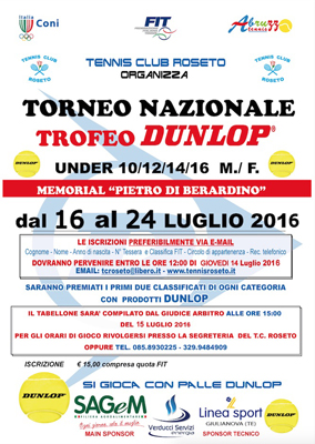 ROSETO DEGLI ABRUZZI (TE) – Prenderanno il via sabato 16 luglio sui campi del Tennis Cub Roseto gli incontri del Torneo Nazionale Giovanile Memorial ‘P. Di Berardino’ riservato alle categorie Under 10, 12, 14, 16, maschile e femminile.