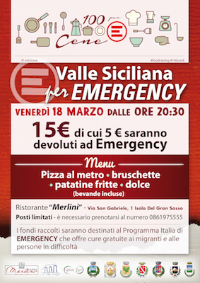 Il gruppo di volontari di Teramo, in collaborazione con le associazioni “Le tre porte” e “Genius Loci”, parteciperà con l’iniziativa “Valle Siciliana per Emergency” proponendo, per venerdì 18 marzo, una serata all’insegna della solidarietà e del buon cibo presso il ristorante Merlini di Isola Del Gran Sasso (TE).