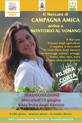 MONTORIO AL VOMANO (TE) – Inaugurazione del mercato di Campagna Amica a Montorio al Vomano. Con il tradizionale taglio del nastro, aprirà domani 15 giugno alle ore 9.30 il nuovo mercato a km zero firmato da Coldiretti Teramo e Campagna amica in Viale Duca degli Abruzzi, di fronte all’istituto tecnico commerciale. Otto gazebo in cui i produttori agricoli teramani venderanno ogni genere di produzione tipica: dai salumi ai formaggi passando per gli ortaggi, la frutta e le confetture. E non mancherà neanche la porchetta di maiale rigorosamente abruzzese.