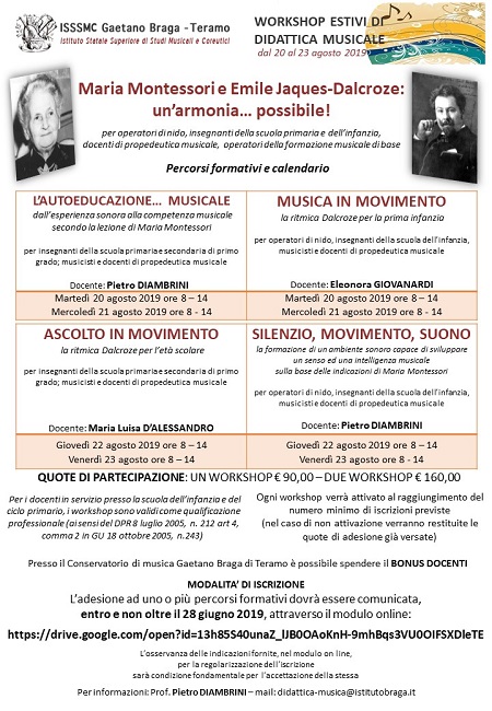 “Tema dei Workshop 2019 – ha spiegato il Direttore del Conservatorio Federico Paci – sarà ‘Maria Montessori ed Emile Jacques-Dalcroze: un’armonia…possibile’, un viaggio esperienziale tra le esperienze di due dei maggiori formatori di ogni tempo, per scoprire approcci diversi alla didattica musicale, comunque compatibili e conciliabili nell’attività odierna. Soprattutto i Corsi saranno l’occasione per approfondire l’attività formativa del nostro Conservatorio ampliando la platea dei partecipanti”.