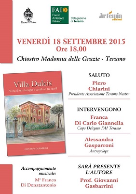 TERAMO – Venerdì 18 Settembre 2015 alle ore 18 presso il Chiostro Madonna delle Grazie a Teramo, presentazione del libro Villa Dulcis del prof. Giovanni Gasbarrini. Teramo Nostra, FAI delegazione di Teramo ed Artemia Edizioni organizzano dunque un salotto culturale per la presentazione del volume, pubblicato da Artemia Edizioni di Mosciano Sant’Angelo.