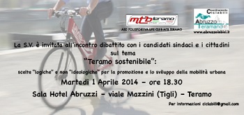 TERAMO – Il prossimo 1 aprile, dalle ore 18.30, presso l’Hotel Abruzzi di viale Mazzini (I Tigli) di Teramo, il Coordinamento Ciclabili Abruzzo Teramano e la ASD LIFE CLUB MTB Teramo, organizzano un incontro dibattito con i candidati sindaci al Comune di Teramo, sul tema “Teramo sostenibile: scelte logiche e non ideologiche per la promozione e lo sviluppo della mobilità urbana”.