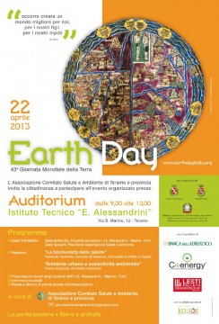 TERAMO – Lunedì 22 aprile 2013 si celebrerà in tutto il mondo la “Giornata Mondiale della Terra” (43° EARTH DAY). Molteplici le iniziative a livello nazionale ed internazionale. L’Associazione di volontariato “Comitato ambiente salute di Teramo e Provincia” ha organizzato, in sinergia con gli Istituti scolastici Alessandrini, Marino, Forti, un evento che si terrà il prossimo 22 Aprile presso l’Auditorium dell’ Istituto di Istruzione Superiore Alessandrini in via San Marino dalle ore 9.30 alle ore 13.00. Saranno affrontati , attraverso momenti diversi , temi legati alla biodiversità delle piante, all’ambiente urbano, al risparmio energetico, alle energie alternative, agli ecosistemi ed alle “azioni del buon senso”. Sono previsti intermezzi musicali.
