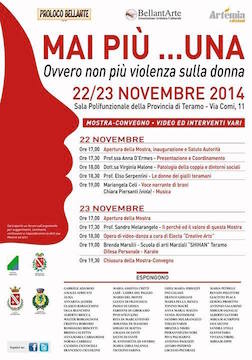 TERAMO – La Proloco Bellante,BellantArte – Associazione Artistica Culturale,Artemia Edizioni in collaborazione con:REGIONE ABRUZZO,CITTÀ DI TERAMO,PROVINCIA DI TERAMO,COMUNE DI BELLANTE organizzano nei giorni 22 e 23 novembre 2014,presso la Sala Polifunzionale della Provincia di Teramo,in Via Comi, 11 l’evento:Mai più’…una – Ovvero non più violenza sulla donna che prevede una mostra-Convegno,un video ed interventi vari.L’iniziativa nasce in prossimità della giornata internazionale per l’eliminazione della violenza contro le donne, che si celebra il 25 Novembre. Ha l’obiettivo di sensibilizzare e informare, far pensare e riflettere su una vera e propria emergenza sociale che conta milioni di vittime al femminile in tutto il mondo.