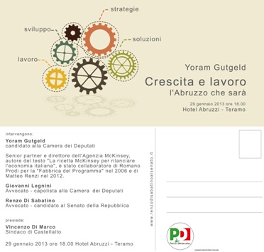 TERAMO – Oggi, 29 gennaio, alle ore 18.00, presso l’hotel Abruzzi si terrà un Convegno incentrato sui temi: crescita, lavoro, i nodi della crisi e quale sviluppo per ‘L’Abruzzo che sarà’ , dove prenderà parte l’economista israeliano Yoram Gutgeld.