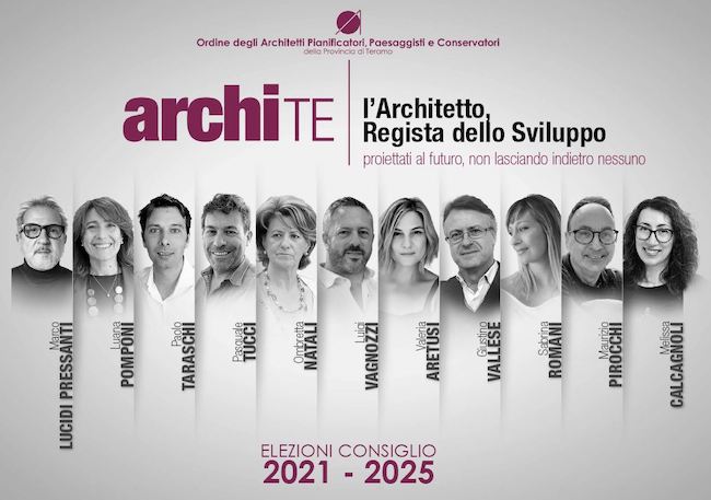 TERAMO – Ordine Architetti, Pianificatori, Paesaggisti e Conservatori della provincia di Teramo. Eletto nuovo Consiglio. Le votazioni per il rinnovo del Consiglio dell’Ordine degli Architetti PPC della provincia di Teramo, per il quadriennio 2021/2025, concluse in data 07-06-2021, hanno portato all’elezione dei seguenti consiglieri: