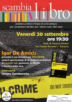 TERAMO – Dopo la pausa estiva torna Scambialibro, l’appuntamento con la lettura a costo zero promosso dall’Associazione culturale “Detto tra noi” di Teramo. Nell’occasione, Igor De Amicis presenterà l’ebook della Rizzoli “Dogs”, primo volume digitale di una serie chiamata You crime, in cui appare il suo racconto intitolato “O’ primario”. Igor De Amicis è commissario di Polizia Penitenziaria e collaboratore delle riviste giuridiche de “Il Sole 24 Ore”. Ha scritto numerosi racconti presenti in diverse antologie e sul web, collabora con “Thrillermagazine” e con la rivista “Sherlock Magazine”.
