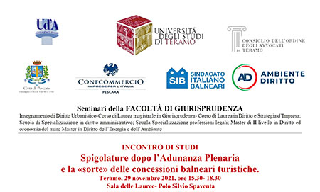 TERAMO – Il Sindaco di Fossacesia, Enrico Di Giuseppantonio, in qualità di Vicepresidente del Consiglio Nazionale dell’ Associazione Nazionale Comuni Italiani (ANCI)e Gianguido D’Alberto, sindaco di Teramo e presidente ANCI Abruzzo, oggi, lunedì 29 novembre 2021, interverranno all’incontro studi sul tema :”Spigolature dopo l’Adunanza Plenaria e la «sorte» delle concessioni balneari turistiche”, che si terrà presso la Sala delle Lauree-Polo Silvio Spaventa-dell’Università di Teramo. I lavori, che prenderanno il via alle 15.30 e si concluderanno alle 18.30 rientrano tra i Seminari promossi dalla Facoltà Di Giurisprudenza dell’UniTe. Vi parteciperanno con i saluti, Dino Mastrocola, Magnifico Rettore Università degli Studi di Teramo, Paolo Marchetti, Preside Facoltà di Giurisprudenza, Elisabetta G. Rosafio, Coordinatore Master di II livello in Diritto ed economia del mare, Emanuela Arezzo, Presidente Corso di Laurea DESI, Enzo Di Salvatore, Coordinatore Master II Livello in Diritto dell’energia e dell’ambiente, Antonio Lessiani, Presidente Ordine Avvocati di Teramo, Riccardo Padovano, Presidente Confcommercio-Pescara.