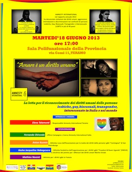 TERAMO – Domani,18 giugno 2013 Amnesty International Teramo organizza il convegno sul tema “Amare è un diritto umano. La lotta per il riconoscimento dei diritti umani delle persone lesbiche, gay, bisessuali, transgender e intersessuate” (Lgbti) che si svolgerà presso la Sala Polifunzionale della Provincia di Teramo in via Comi 11 alle ore 17.00.L’evento vedrà la partecipazione di tre ospiti internazionali: Anton Kuzmin, attivista dell’associazione Comingout di San Pietroburgo (Russia), Kasha Jacqueline Nabagesera, attivista ugandese di Freedom & Roam (Uganda) e vincitrice del premio per i difensori dei diritti umani Martin Ennals e Mathieu Nocent dell’associazione Inter- Lgbti (Francia).Interverranno inoltre Fernando Chironda, coordinatore campagne Amnesty International Italia e i rappresentanti di Arcigay Teramo, Arcigay L’Aquila, Arcigay Pescara, Arcigay Chieti, Collettivo universitario “La mala educación” dell’Università D’Annunzio di Chieti, Jonathan – Diritti in movimento e Amnesty International Teramo.Gli ospiti internazionali, in Italia dal 10 al 22 giugno, prenderanno parte a incontri istituzionali, workshop e conferenze organizzati in diverse città italiane tra cui, oltre a Teramo, Roma, Bologna, Firenze, Mantova, Milano, Saronno e Reggio Emilia, nell’ambito di un ciclo di incontri promosso da Amnesty International Italia in occasione del Pride nazionale, che si terrà a Palermo il 22 giugno.“Vogliamo creare, attraverso le loro testimonianze dirette, uno spazio di riflessione e azione per denunciare e lottare contro ogni discriminazione e violenza motivata dall’odio fondato sull’orientamento sessuale e sull’identità di genere in Italia e nel mondo” – ha dichiarato Elena Talamonti, responsabile del Gruppo teramano di Amnesty International. “Siamo convinti che occorra anzitutto un intervento culturale volto a infrangere falsi cliché e pregiudizi che stanno alla base degli atti e dei comportamenti omofobici”.