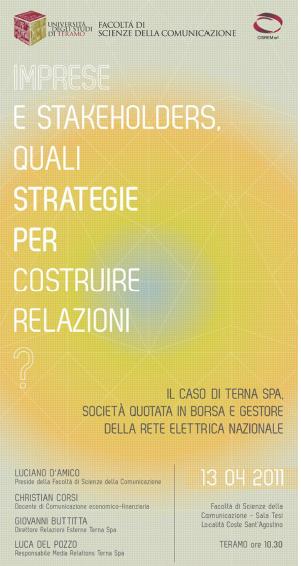 TERAMO – Mercoledì , 13 aprile, alle ore 10.30, presso la Sala tesi della Facoltà di Scienze della Comunicazione di Teramo, si terrà un Convegno dal titolo “Imprese e stakeholders, quali strategie per costruire relazioni? ” L’incontro sarà focalizzato sul caso Terna SpA, società quotata in borsa e gestore della rete elettrica nazionale.