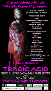 TERAMO – Il 7 e l’8 giugno 2013, alle ore 21.00, al Teatro Romano di Teramo,l’Associazione culturale “Mariella Converti” presenta: Tragic Acid- studio su Medea, Cassandra e Clitemnestra.Lo spettacolo,puntando su tre figure femminili di enorme potenza e personalità, vuole essere un omaggio alla indimenticabile artista , Mariella Converti,una delle più importanti e carismatiche figure della cultura teramana .