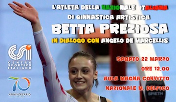 Il primo di questi, vedrà protagonista il dialogo tra la Campionessa di Ginnastica Artistica Elisabetta “Betta” Preziosa e il Presidente del CSI Angelo De Marcellis. L’evento si terrà Sabato 22 Marzo 2014 ,alle ore 12.00, nell’Aula Magna del Convitto “Melchiorre Delfico” a Teramo.