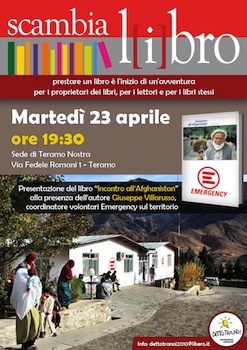 TERAMO – Domani,23 aprile,alle ore 19.30,presso la sede di Teramo Nostra, in via Fedele Romani,1 torna l’appuntamento con lo Scambialibro. In collaborazione con il gruppo volontari Emergency di Teramo, lo Scambialibro di aprile avrà come protagonista Giuseppe Villarusso, storico volontario e coordinatore nazionale dei gruppi territoriali di Emergency. Il suo libro “Incontro all’Afghanistan” racconta per immagini l’attività di tre ospedali dell’Associazione attivi dal 1999: ad Anabah nella valle del Panshir, a Kabul e a Laskar-gah.