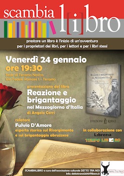 Il libro che verrà presentato è la riedizione di “Reazione e Brigantaggio nel Mezzogiorno d’Italia”: volume del 1893 sul brigantaggio e la sua genesi scritto da Angelo Cerri e curato per la ristampa da Fulvio D’Amore, ospite gradito assieme all’editore.