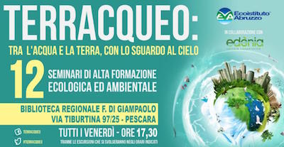 PESCARA – Da venerdì 13 maggio prossimo fino all’autunno inoltrato, per 12 incontri, si terrà TERRACQUEO, serie di seminari di alta formazione ecologica e ambientale, promossi dall’Ecoistituto Abruzzo in collaborazione con edènia soc. coop., dedicati ai temi dell’acqua e della terra e rivolti soprattutto agli amministratori pubblici, agli operatori del settore e ai cittadini.