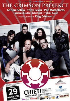 CHIETI – Sabato 29 marzo 2014 alle ore 21, presso Auditorium Supercinema di Chieti, concerto dei The Crimson ProjeKCt, la super Band che comprende ben tre membri dei King Crimson (Adrian Belew, Tony Levin e Pat Mastelotto) i quali insieme a musicisti d’eccellenza (Markus Reuter, Julie Slick e Tobias Ralph) riproporranno la discografia che consacrò i mostri sacri del prog al rango di divinità terrene.